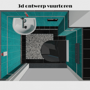 De wanden zijn uitgevoerd in blauwgekleurde handvorm tegeltjes van 10×10 cm, grijs gevoegd. Afgewerkt met een subtiel zwart stripje en een afgeronde bovenrand van 20 cm in klassiek zwart.