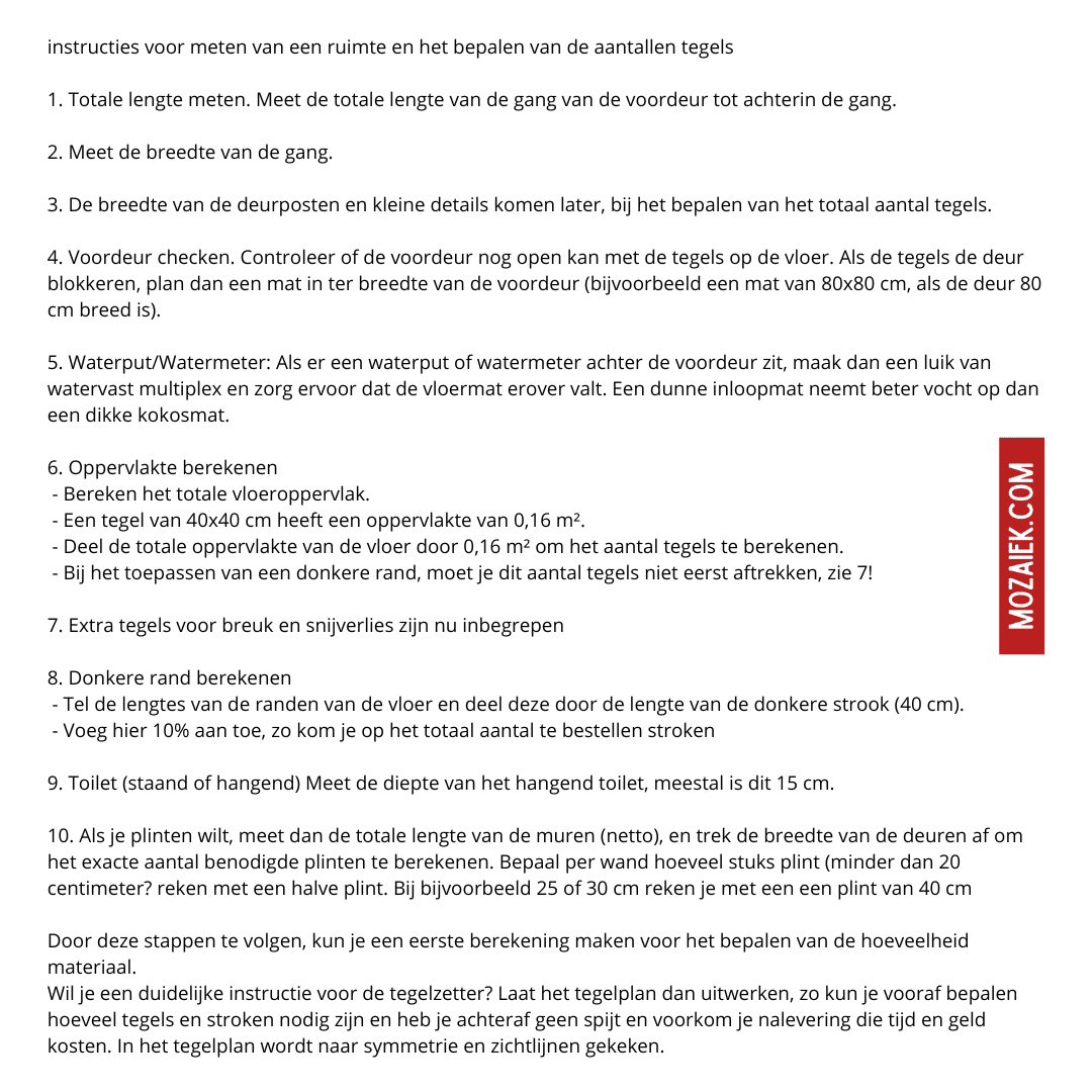 9. Voegmaat 2-3mm, voegkleur: overleg met tegelzetter!