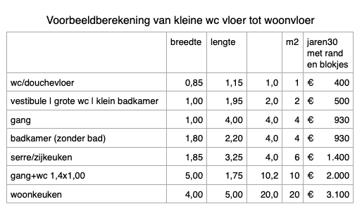 • Vloerprijzen variëren: een vloer met alleen 40×40 cm middenvlaktegels is goedkoper dan met randstroken en zwart-witte blokjes. Vraag naar een offerte